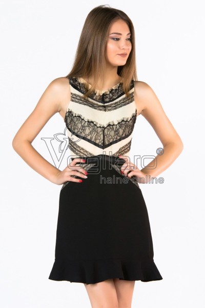 Feminina si diafana, rochia de ocazie Ivette imbina cu usurinta un design aparte si trei tesaturi deosebite intr-un melanj atragator. Avand o cromatica moderna, in nuante nude si negru care complimenteaza orice tip de silueta, rochia este realizata din triplu voal cu margine cu volane. Bustul nude impreuna cu insertiile din dantela neagra creaza un mix deosebit, sugerand o tinuta sofisticata, cu care nu vei da gres la niciunul din evenimentele speciale din viata ta. Rochi eleganta scurta Ivette se inchide cu fermoar ascuns ascuns la spate.