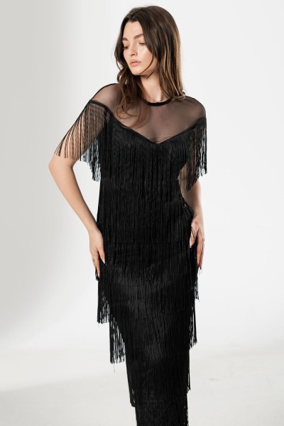 Rochie lungă de seară neagră cu franjuri – creată pentru apariții memorabile