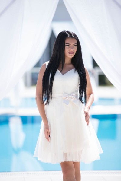 Rochie de ocazie din tull, captusita pe interior pentru un aspect bufant. Este o rochie eleganta si delicata, cu spatele plin si accesoriu in talie, pe care o poti purta la evenimente speciale: nunta sau botez.